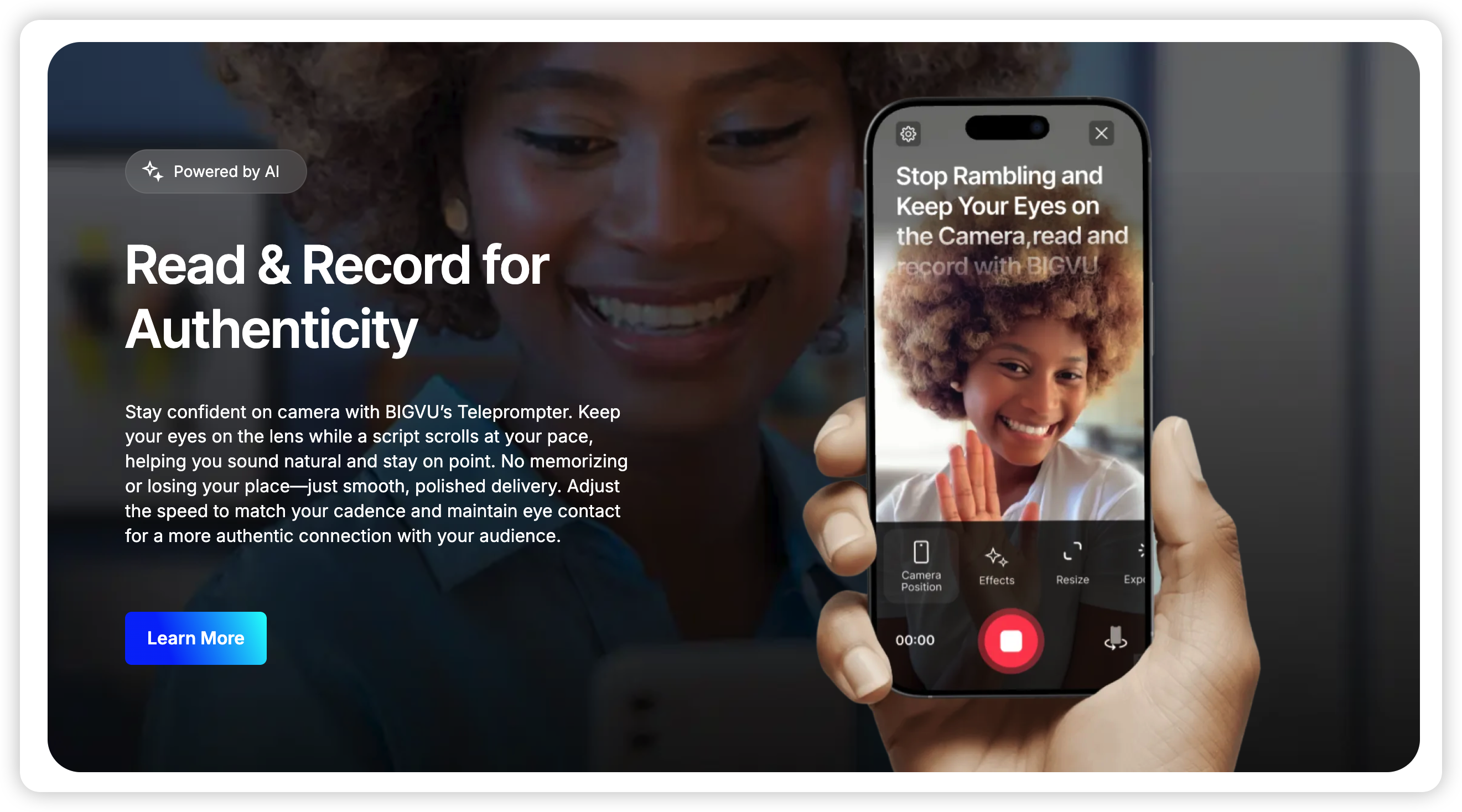 BigVu isn't just a teleprompter—it's a complete video creation suite. The app integrates teleprompting with video editing, captioning, and social media scheduling, making it a favorite among social media managers and content marketers.